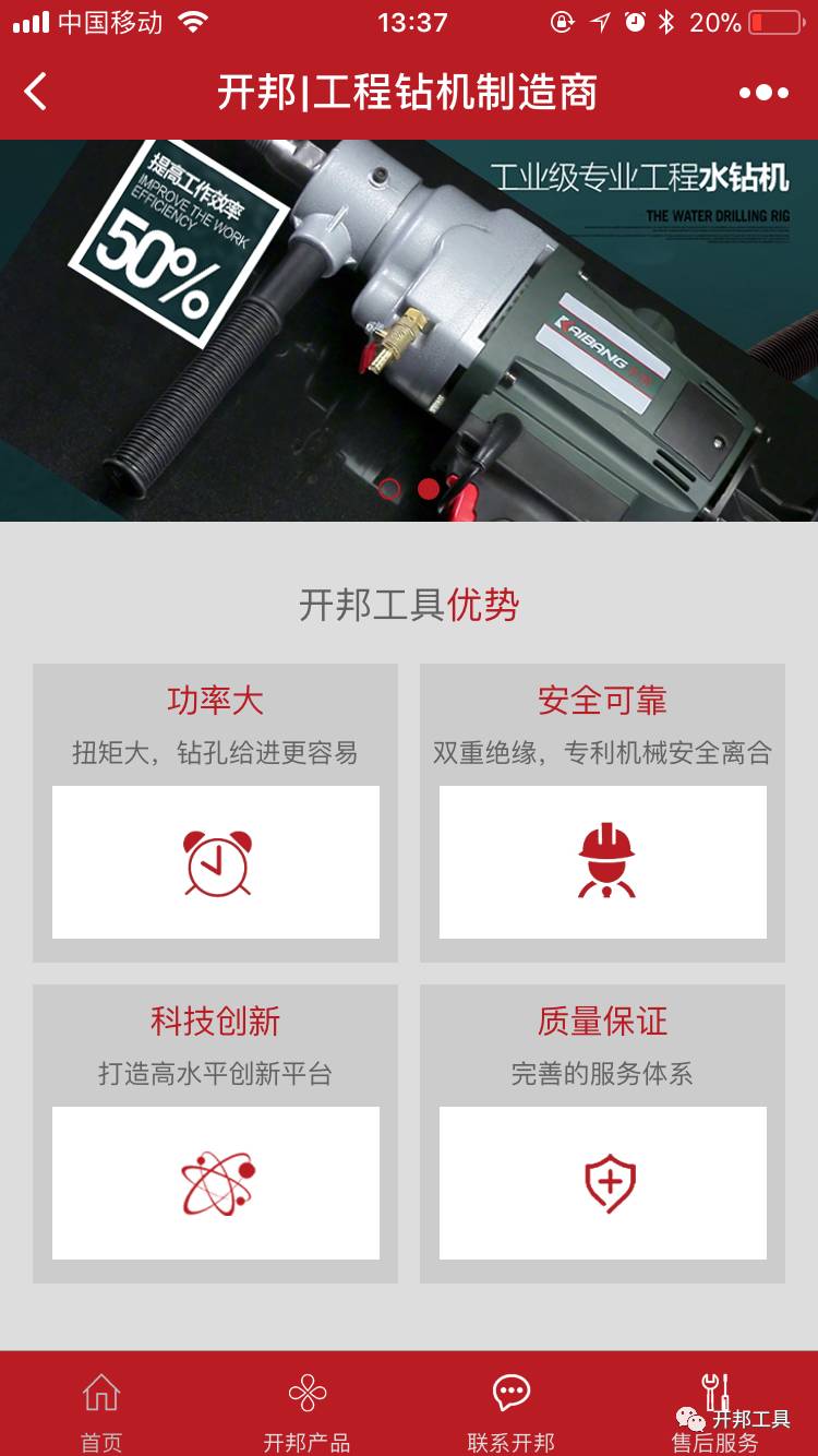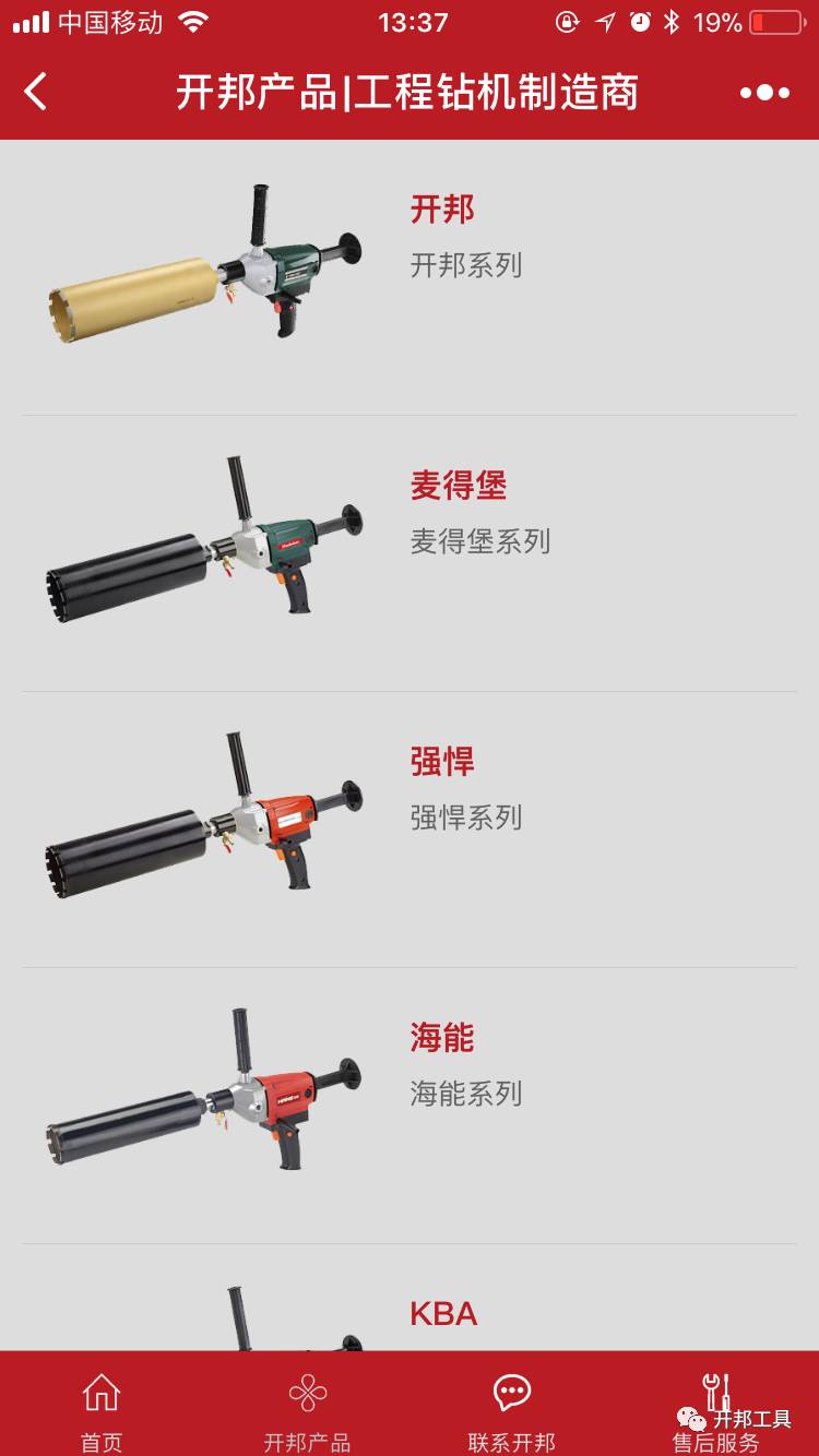 點(diǎn)擊進(jìn)入「帶水源金剛石鉆」小程序以后,首頁界面簡潔醒目的陳列,方便你快速了解產(chǎn)品。點(diǎn)擊“開邦產(chǎn)品”按鈕,可以看到開邦的產(chǎn)品的各個(gè)分類。